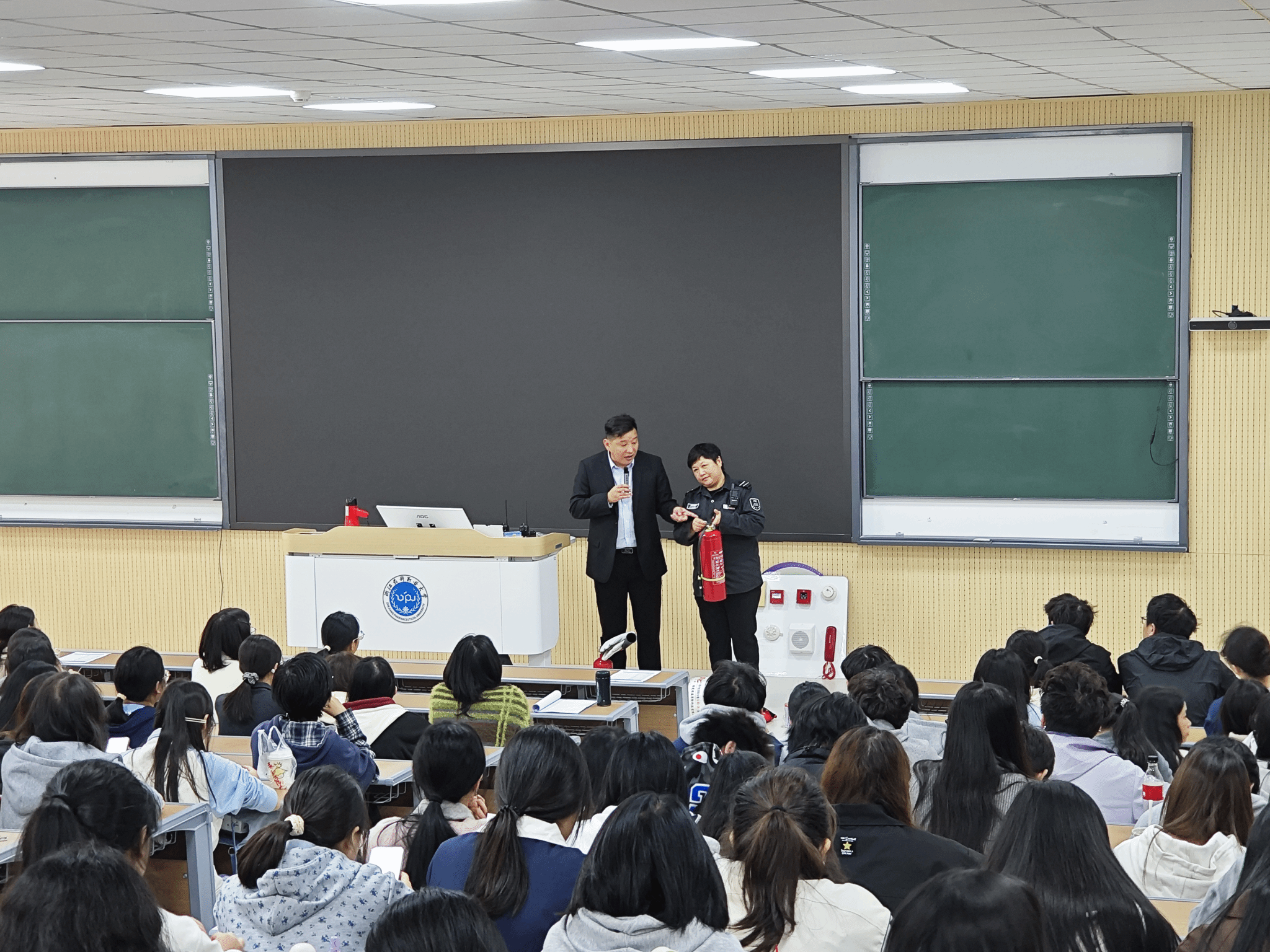 在消防基本知识讲解环节,校保卫部专业消防人员结合真实案例,详尽介绍了火灾的成因、预防措施以及应急处置方法,师生认真聆听,积极互动。接着,校保卫部奚志伟队长进行了消防基本知识讲解,详细阐述了火灾成因、预防措施及应对方法,夯实了理论基础,确保在火情初期能够科学应对。学校每个教室配备干粉和二氧化碳灭火器,讲解使用四字口诀:“提、拔、握、压”。介绍灭火毯的玻璃纤维材质及遮挡用法;演示火灾报警控制器操作和应急预案流程;讲解火灾显示盘、烟感报警器、感温器功能以及消防水带等消防器材工作原理及使用方法。